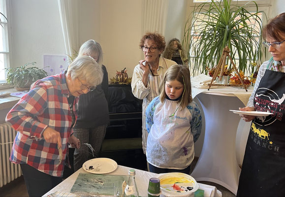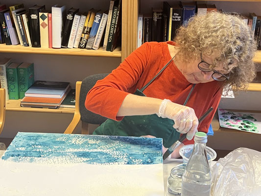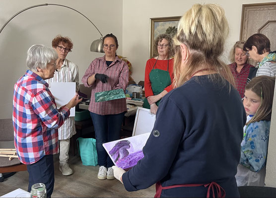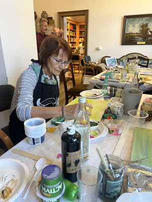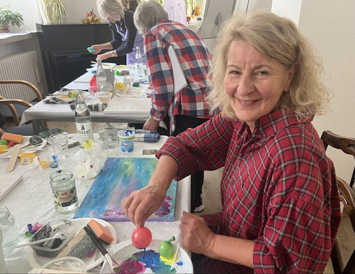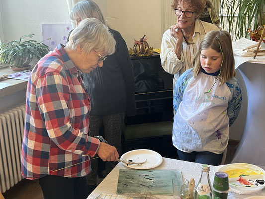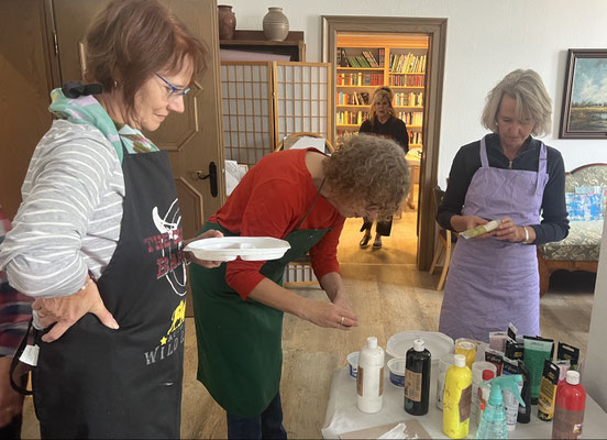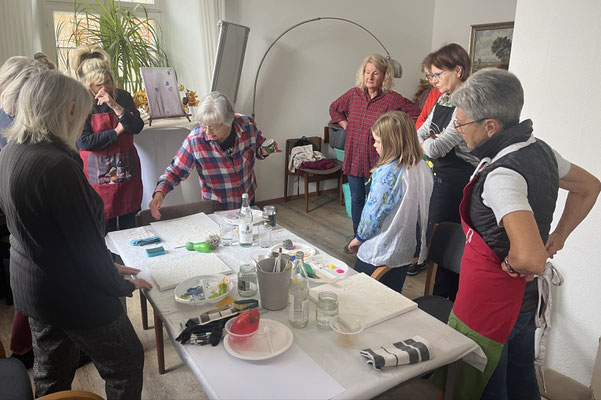 Zeit zum Malen ist auch immer Zeit, die einem etwas zurückgibt! Das können auch die Teilnehmerinnen des Malwochenendes im MGH sagen. Kursleiterin Georgina Gartenbach vermittelte verschiedene Techniken des Acylmalens vom Blütentupfen mit Luftballons über, Strukturen aufbauen bis hin zum Malen mit Gräsern. Doch auch etwas Theorie in der Farbenlehre und wie man ein Bild aufbaut waren ihr wichtig. Stolz trugen die Teilnehmerinnen von 9 bis 79 Jahren ihre Werke nach Hause. Wir wünschen viel Spaß beim weiteren Ausprobieren!