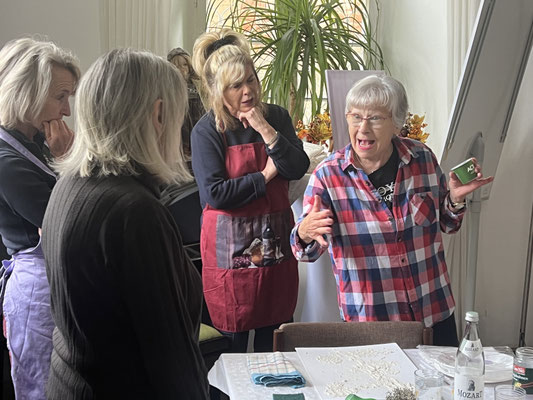 „Vielen Dank Georgina für das schöne Malwochenende im Mehrgenerationenhaus. Ich hätte nicht gedacht, dass ich so ein Bild gestalten kann!“ Mit viel Lob verabschiedeten sich die Teilnehmerinnen unisono bei der Kursleiterin, die Ihnen nicht nur verschiedenste Techniken näher gebracht hatte, sondern sie auch mitnahm zu einem spannenden Ausflug in die Farbenlehre. Und die Resultate können sich sehen lassen!